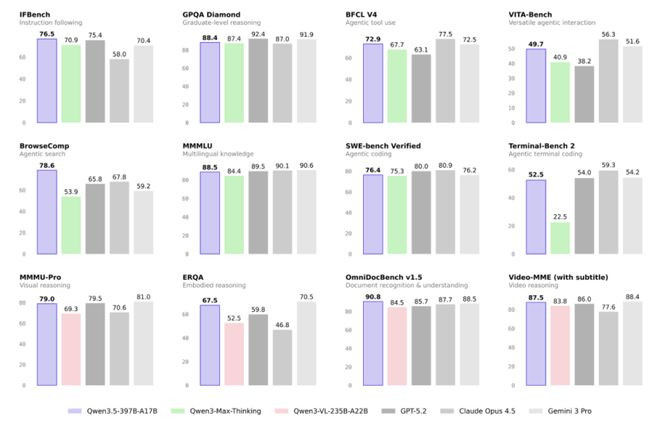 ·在通用Agent评测BFCL-V4、搜索Agent评测Browsecomp等基准中,千问3.5发扬与Gemini3Pro、GPT-5.2比较性能更优。