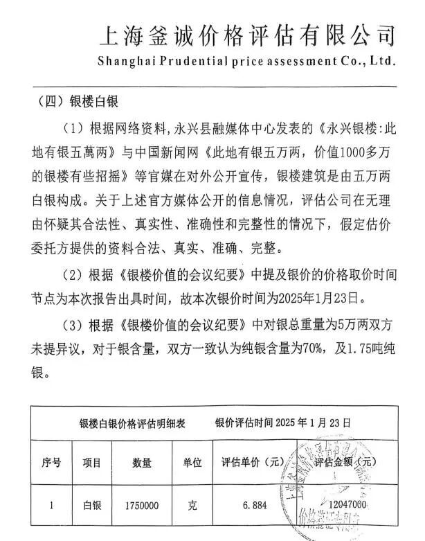 湖南鑫达上传平台的一份价格评估报告书还称,根据永兴县融媒体中心发表的《永兴银楼:此地有银五萬两》与中国新闻网《此地有银五万两,价值1000多万的银楼有些招摇》等媒体在对外公开宣传,银楼建筑是由5万两白银构成。评估报告书称还称,根据《银楼价值的会议纪要》,本次银价取价时间为2025年1月23日。对银总重量为5万两未提异议,亚搏对于银含量一致认为纯银含量为70%,即5万两(2.5吨)银中含纯银1.75吨,评估单价为纯银6.884元/克。