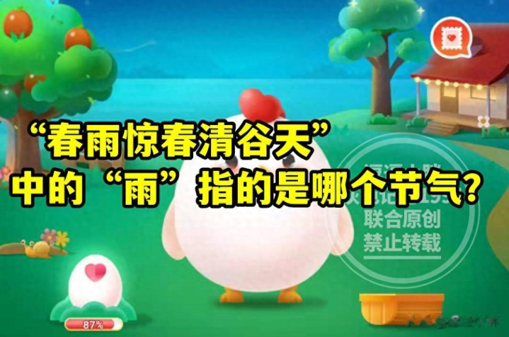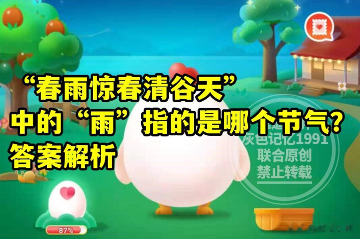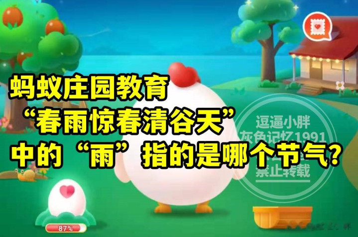 亚搏手机app下载 “春雨惊春清谷天”中的“雨”指的是哪个骨气? 蚂蚁庄园教练谜底