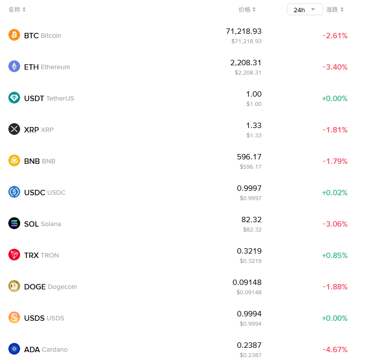 同期,加密货币阛阓再次集体走低,比特币价钱日内一度跌至70500好意思元隔壁。领域北京技艺9:10,比特币价钱报71218.93好意思元,近24小时下落2.61。