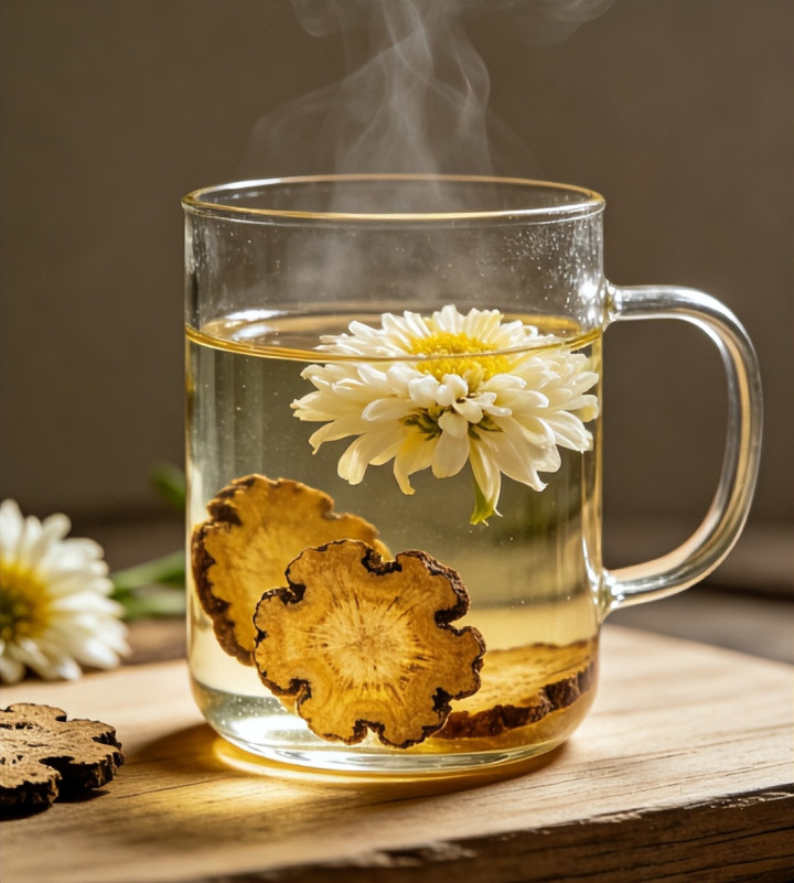 川芎3克(活血行气,祛风止痛)、菊花5朵(平肝明目,清热)、冰糖少许。沸水冲泡。川芎是“血中气药”,专治上行头目的疼痛;菊花能清热,防上火。适合感觉脖子僵硬伴有头痛、心烦的人。注意,孕妇不宜。