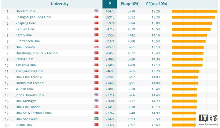 可以看到,亚搏app官网版浙江大学凭借40492篇核心出版物论文遥遥领先于其他大学;不过P(top10%)数据中美国哈佛大学依然一骑绝尘,达到7003篇,因此还是要正视差距,继续加油。