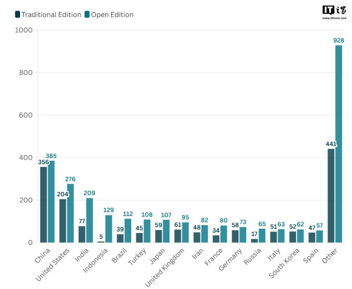 {jz:field.toptypename/}从上榜大学数量来看,不管是传统版还是开放版,中国大学依然排名第一,分别达到了356所和385所,美国上榜大学数量排名第二,印度第三。