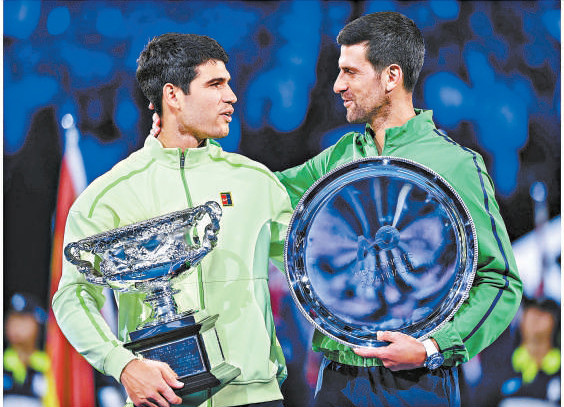 阿尔卡拉斯(左)与德约科维奇在颁奖仪式上。新华社供图