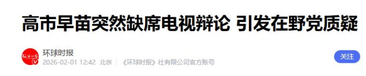 2026-02-01环球时报《高市早苗突然缺席电视辩论 引发在野党质疑》