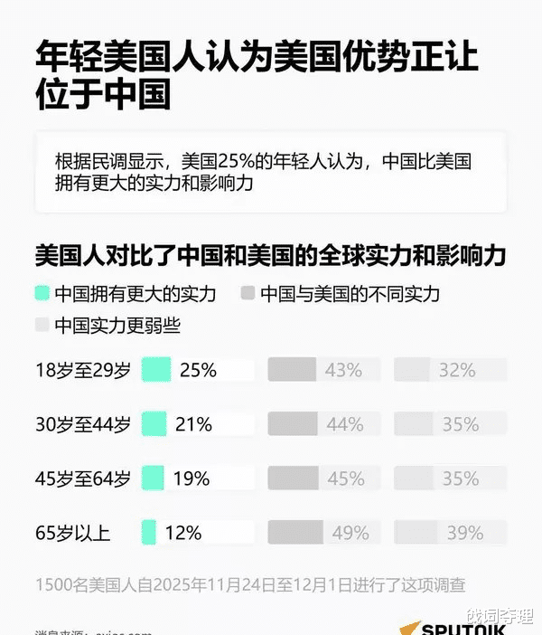 当TikTok上的美国Z世代刷着中国博主的高铁vlog时,一项民调正在狠狠戳破美国精英的“政治正确”——18至29岁的美国年轻人中,四分之一认为中国的全球实力和影响力已经超越美国。这个数字像一颗投入舆论池的石子,在大洋两岸激起千层浪,更照出美国社会深刻的代际撕裂。