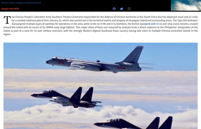 美“Military Watch”网站发文称,解放军出动苏-30MKK护航的轰-6K编队,满载鹰击-12,展示卓越穿透能力,菲律宾海空军根本无力防御。