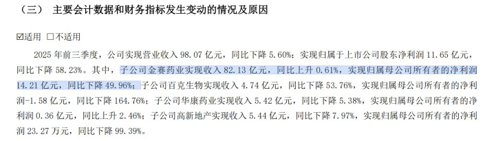 然而,2025年前三季度来看,金赛药业虽然保持营收正增长,实现收入82.13亿元同比微增0.61%,但归属母公司所有者的净利润却下降了49.96%至14.21亿元,利润下滑幅度远超收入增幅。这种营收微增、利润暴跌的现象,揭示出生长激素业务正承受前所未有的发展压力。