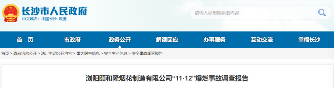 2025年11月12日,湖南省浏阳市颐和隆烟花制造有限公司一车间发生爆燃,过火面积约140㎡,造成3人重伤、2人轻伤,直接经济损失93.3万元。2026年2月3日,长沙市人民政府网站公布该起事故调查报告。