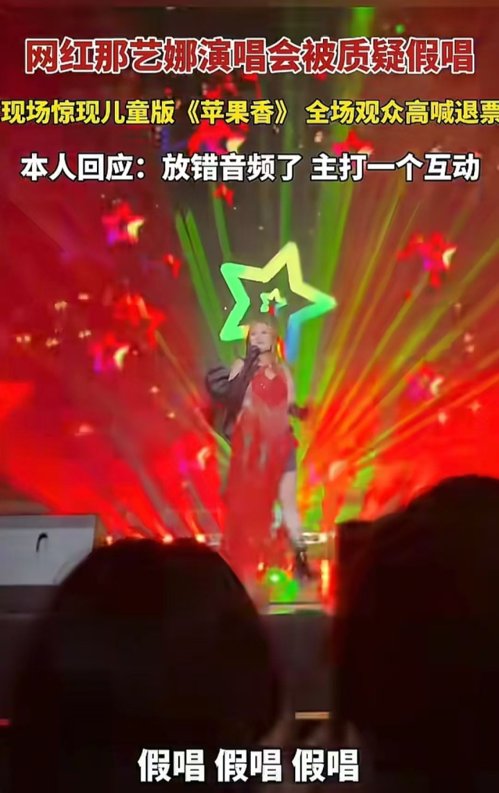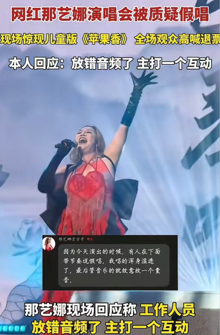 她唱《苹果香》的时候,甚至把伴奏放成了童声版,但那艺娜在台上一点都没慌,依旧“专业素养”特别强的跟着对口型。