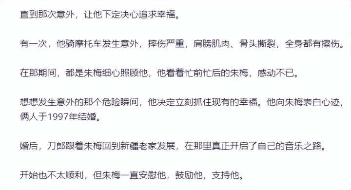两人相识后,一次刀郎和朋友骑摩托出门,意外翻车,全身多处擦伤,肩膀也受了伤。