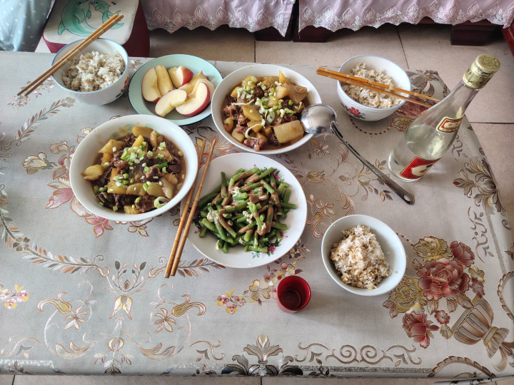 中午炖了两斤牛肉,吃了一多半,炖好的牛肉里加了冬瓜和土豆,拌了一个麻酱豆角,喝了两小杯白酒,大致一两的样子,只吃了一小口燕麦大米杂粮饭。