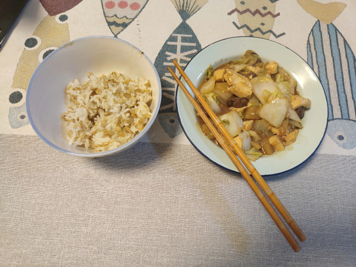 晚饭吃的碳水也不多,白菜豆腐里炖了点牛肉,少吃了一口杂粮饭。