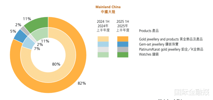 从产品结构来看,黄金饰品及产品对周生生的业绩贡献度持续提升。2025年上半年,黄金饰品及产品占中国大陆地区销售总额的82%,占中国香港和澳门地区销售总额的77%,两大市场的占比均有不同程度的提升。