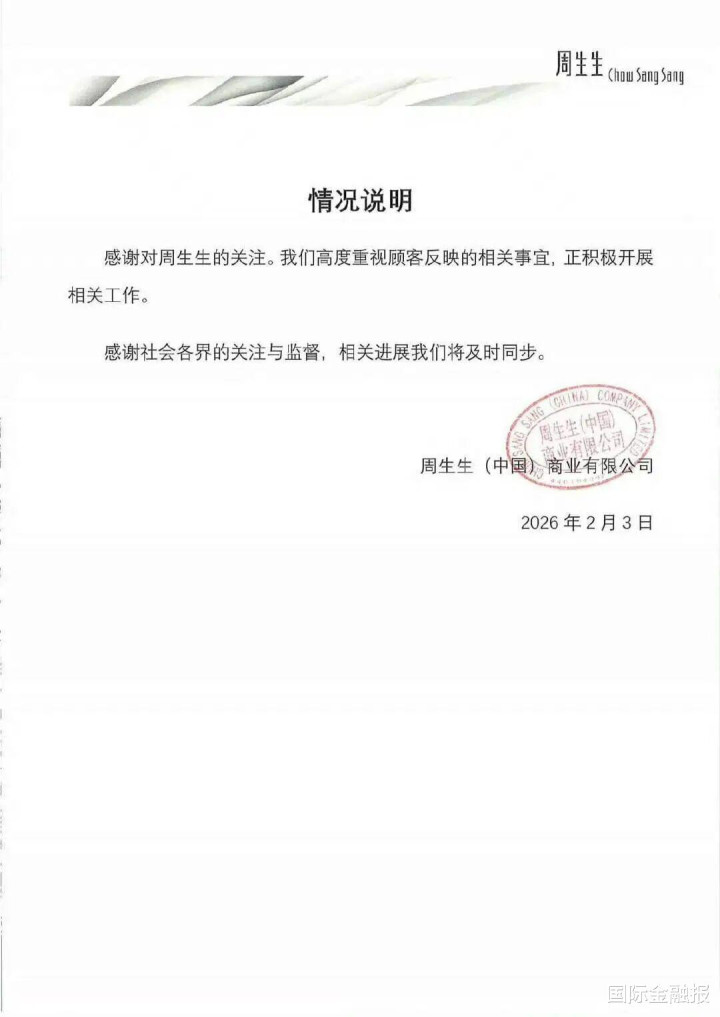 随着舆论持续升温,周生生通过官方微博发布了情况说明,但其中并未明确提及出现上述问题的具体原因。记者也致电周生生官方客服询问调查进展,但未有更多信息可以透露。