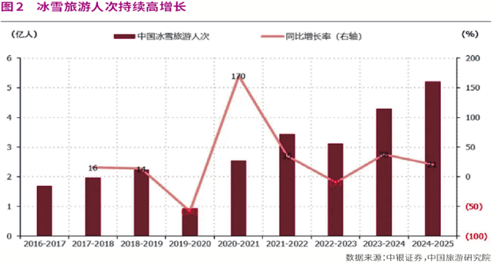 此外,随着2022年北京冬奥会成功申办与举办,在全国范围内兴建了一批高标准的冰雪场馆和度假区,冰雪运动的宣传和普及也吸引了越来越多的民众参与到冰雪运动和旅游中来。2024年—2025年雪季旅游人次已达5.2亿,同比增速达21%,冰雪旅游走热与服务消费韧性之下,2026年冬季冰雪旅游仍有望有较为亮眼的表现,旅游运营及设施生产和运营厂商均有望受益。