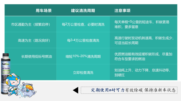 那该何如处理积碳呢?老张的提议是:如期清洗,科学养护,别听东说念主瞎忽悠,也别完全无论。他还跟我整理了不同用车场景的清洗周期,很实用: