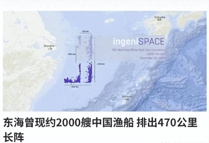 2023年12月24日至26日,就在西方世界沉浸在节日氛围里时,约2000艘中国渔船悄无声息地在东海中日中间线附近集结。如果你调取当时的高清卫片,会看到这根本不是捕鱼,而是一个巨大的“U形”口袋阵——南北绵延470公里,东西横跨80公里。