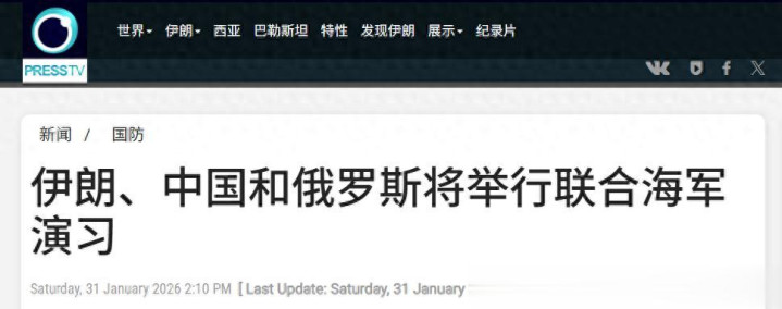 “伊朗、中国和俄罗斯将举行联合海军演习”,当地时间2026年1月31日,伊朗各大媒体,包括法尔斯,presstv报道称,伊朗、俄罗斯和中国将在2月底在印度洋北部举行联合海军演习,同时伊朗与美国之间的战争紧张局势加剧。此次中国,俄罗斯,伊朗的演习,名为“海上安全带”演习,将包括伊朗海军、伊朗革命卫队海军,以及中国海军和俄罗斯海军的部队和舰艇。据伊朗海军官员称,此次演习旨在加强海上安全并加强参与国之间的合作。