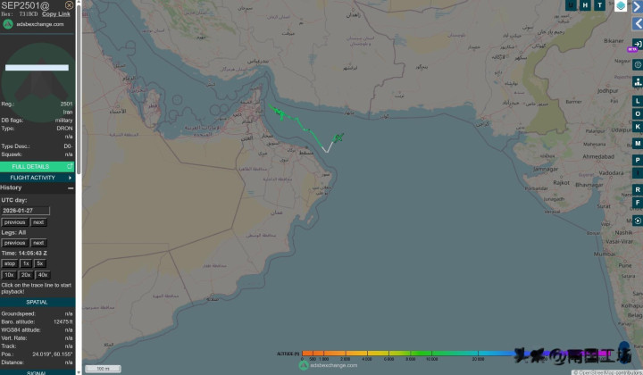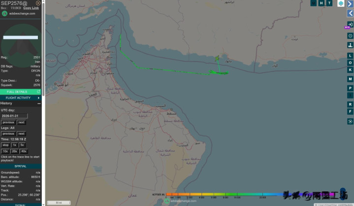 2026年2月1日,根据世界航线航行系统的数据,美国海军林肯号航母打击群抵达北阿拉伯海之后,伊朗继续出动侦察无人机,持续高强度侦察美国海军林肯号航母的位置,伊朗无人机对阿曼湾,波斯湾空域,阿拉伯海北部,进行侦察活动。而根据欧洲卫星图像,Sentinel-2卫星数据显示,美国海军航母林肯号已离开阿曼海,正返航印度洋。
