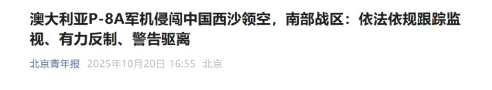 日本似乎也曾健忘2024年7月,它们的“凉月号”斥逐舰客岁是怎么闯入中国领海的;澳大利亚似乎也健忘2025年10月,它们的P-8A巡查机怎么犯罪侵入中国西沙领空的。