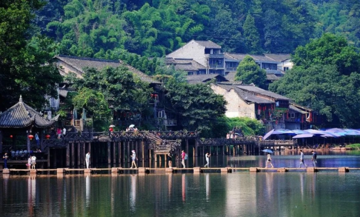 镇中古树参天,黄葛树、桢楠、香樟动辄数百年树龄,根系盘绕老宅墙基,枝叶覆顶成荫。虽说靠山吃山,但当地人从不轻易伐木。人们建房所用的杉梁、竹篾、青瓦,皆取自十里之内,且讲究“轮山歇砍”——今年伐东坡,明年取西岭,山林自有喘息之机。正因林茂水清,吊脚楼才敢大胆探出木柱,悬于河岸之上。