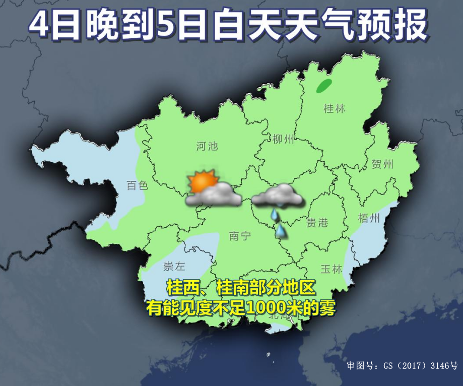 5日白天到晚上,全区多云到阴天大部有小雨。桂西、桂南部分地区有能见度不足1000米的雾。